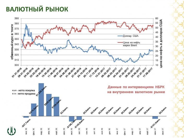 На очередной встрече с экспертами финансового рынка заместитель директора Департамента монетарных операций Национального Банка Адиль Мухамеджанов отметил, что к настоящему моменту ситуация стабилизировалась. По состоянию на 22 августа 2017 года обменный курс сложился на уровне 333,08 тенге за доллар США.
