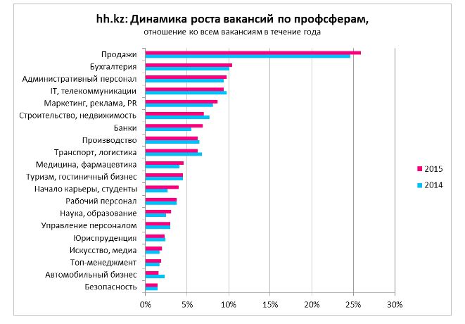 Что касается предлагаемых зарплат, то они стали выше в среднем на 3-5 процентов, считает эксперт. "Сейчас среднестатистический работодатель в Алматы в вакансиях в среднем готов предложить соискателю зарплату в размере 110 тысяч тенге, что на 4,8 процента выше прошлогоднего показателя, в Астане - 120 тысяч тенге (выше, чем в 2014 году на 4,3 процента). Наивысший показатель предлагаемого среднего ежемесячного заработка отмечен в 2015 года в Актау - 125 тысяч тенге (выше, чем в 2014 году на 4,2 процента), и Атырау - 123 тысячи тенге (ниже, чем в 2014-м на 1,6 процента)", - пояснила Быченко.