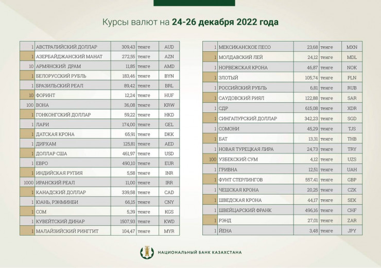 В выходные дни и понедельник официальный курс доллара будет равен 461,97 тенге. Отметим, что официальный курс американской валюты на 23 декабря составляет 466,98 тенге.
