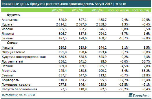 Среди фруктов в августе ощутимо выросли в цене только несезонные апельсины: до 540 тенге за килограмм, и курага до 2 114,2 тенге за килограмм.