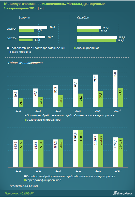 Производство серебра продолжает сокращаться - всего 334,2 тонны за январь-апрель 2018 года. Это на 6,5 процента меньше, чем годом ранее. Из них 331,5 тонны - аффинированного, на 6,8 процента меньше, чем год назад.