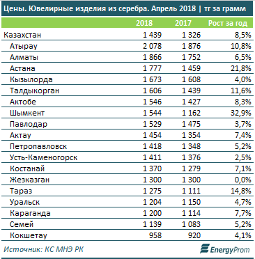 Ювелирные изделия из серебра подорожали примерно так же, как и золотые - плюс 8,5 процента год-к-году, до 1,4 тысячи тенге за грамм.