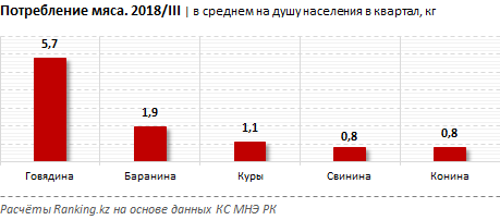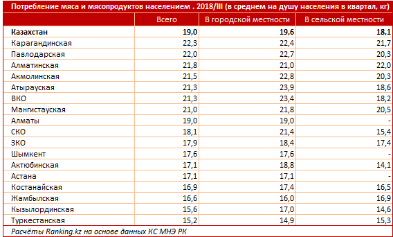 Среди регионов наибольшее потребление населением мяса и мясопродуктов зафиксировано в Карагандинской (22,3 килограмма в среднем на человека), Павлодарской (22 килограмма) и Алматинской (21,8 килограмма) областях.