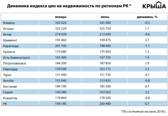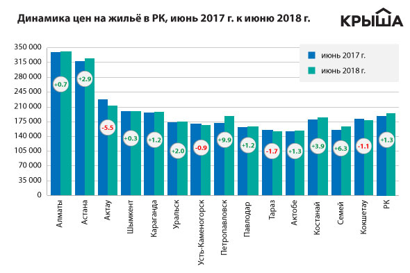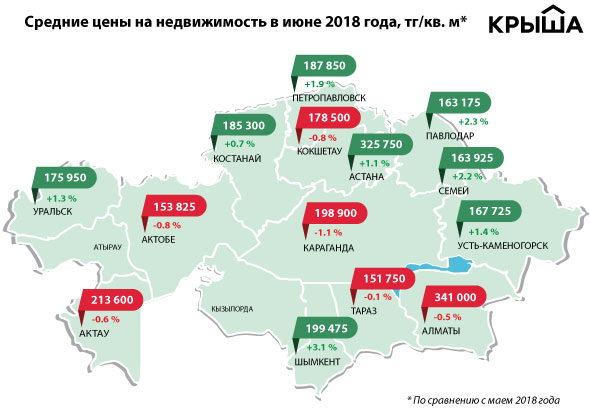 Положительная динамика в пределах 1–4 процента наблюдается (относительно июня 2017 года) в Караганде (+1,2 процента), Павлодаре (+1,2 процента), Актобе (+1,3 процента), Уральске (+2 процента ), Астане (+2,9 процента) и Костанае (+3,9 процента). В Алматы и Шымкенте зафиксирован прирост, но менее значительный: 0,7 и 0,3 процента соответственно.