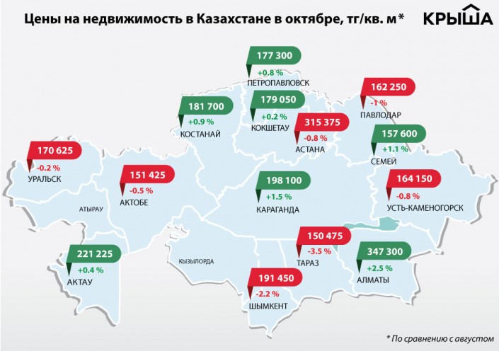 При этом столица Казахстана из числа городов с растущими ценами на жилье выбыла. Положительный тренд там наблюдался в августе (плюс 1,1 процента ) и сентябре (плюс 1,4 процента). В октябре же произошло снижение на 0,8 процента. Сейчас индекс цен на квартиры в столице составляет 315 375 тенге за квадратный метр.