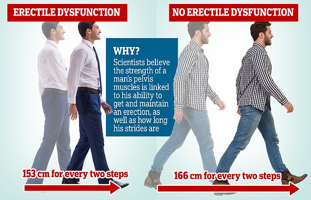 Как показали ранее проведенные исследования, склонность к развитию импотенции у семенящих мужчин, вероятнее всего, связана с тем, что короткий шаг часто коррелирует со слабыми мышцами тазового дна, которые поддерживают мочевой пузырь, кишечник, а также задействованы в реализации половой функции. При более длинных шагах наблюдается улучшенное кровоснабжение органов таза, что сказывается и на потенции.