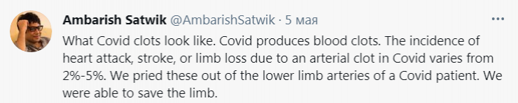 "Частота образования тромбов в кровеносных сосудах очень высока. Если сгусток образуется в коронарной артерии, которая снабжает кровью сердце, это может привести к сердечному приступу. Точно так же, если сгусток присутствует в кровеносных сосудах, которые снабжают головной мозг, у пациента может случиться инсульт. В некоторых случаях поражение периферических кровеносных сосудов может привести к потере конечности. Частота этого артериального тромбоза составляет 2-5 процентов. Частота венозного тромбоза довольно высока и составляет около 14-25 процентов", - приводит слова сосудистого хирурга "Страна".