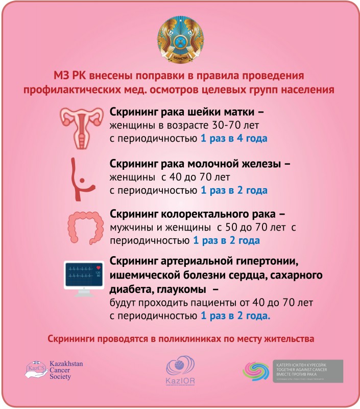 "В Казахстане все скрининговые обследования, диагностика и лечение онкологических заболеваний проводятся бесплатно. В 2019 году Минздрав выделил на проведение скринингов 4,3 миллиарда тенге. В поликлиниках проводятся бесплатные скрининги на рак шейки матки, рак молочной железы и колоректальный рак - то есть самые распространенные виды онкологии в Казахстане. Рак на первой стадии у нас в стране может лечиться почти в 100 процентах случаев, поэтому ранняя диагностика - спасает жизнь", - сказала главный онколог МЗ РК, директор КазНИИ онкологии и радиологии Диляра Кайдарова.