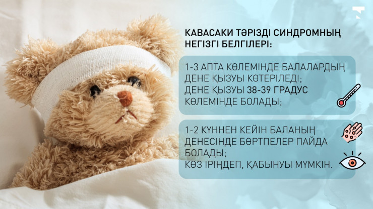 "Кавасаки тәрізді синдром, тағы да қайталап өтейін, ол көбіне коронавирустан кейін пайда болады. Яғни, коронавирустан кейін 1-3 апта көлемінде балалардың қызуы қайтадан көтеріле бастайды. Дене қызуы шамамен 38-39 градус болады. Артынша бір-екі күннен кейін баланың аяқ-қолына, бүкіл денесіне бөртпелер шыға бастайды. Сондай-ақ көзі іріңдеп, қабынуы мүмкін. Синдром қай жүйеге қатты әсер еткен болса, сол жүйенің де қабынуына әкеліп соғуы мүмкін. Яғни, егер ол тыныс жүйесіне шықса, баланың мұрнынан су ағып, жөтеліп, пневмония да пайда болуы мүмкін. Одан бөлек, бүйрек, ми, құлақтың қабыну процесі жүруі мүмкін", - дейді Ғалия Сейдалиева.