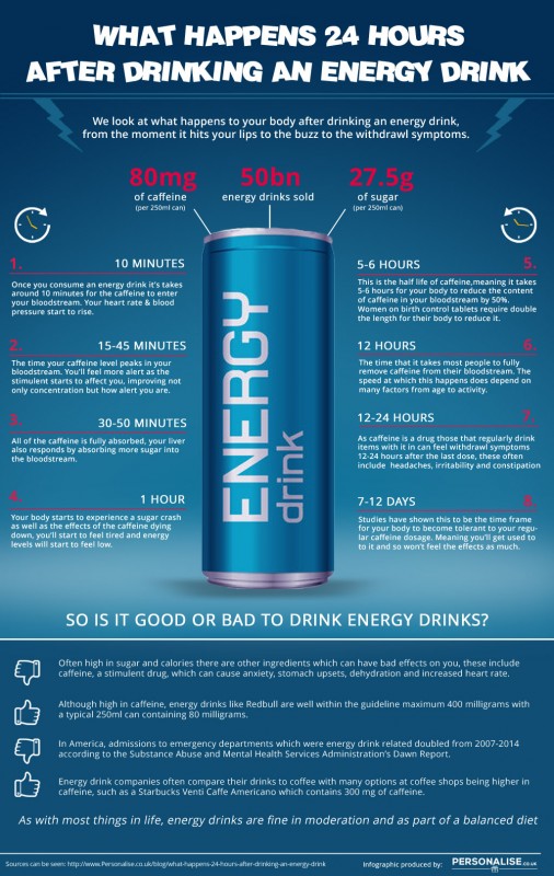 Несмотря на предупреждения о вреде курения и употребления энергетических коктейлей, огромная армия пользователей продолжает курить и пить. Британский портал Personalise представил инфографику, объясняющую, что происходит с организмом человека после одной баночки энергетического напитка.