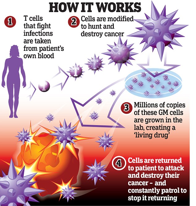 В лаборатории исследователи генетически перепрограммировали Т-клетки с тем, чтобы они распознавали и уничтожали раковые клетки пациентов. Затем кровяные тельца возвращались в кровеносную систему пациентов.
