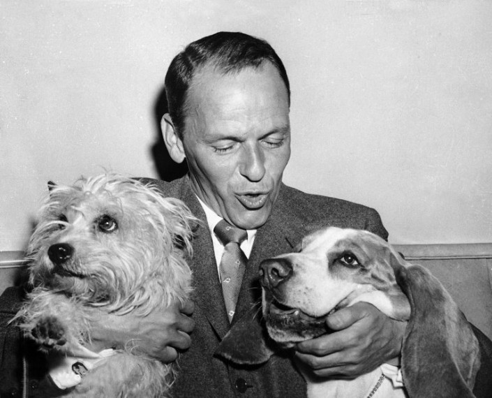 Фрэнк Синатра с "партнерами" по фильму "Приятель Джои" - керн-терьером Снаффи и безымянным бассет-хаундом, 1957 год.