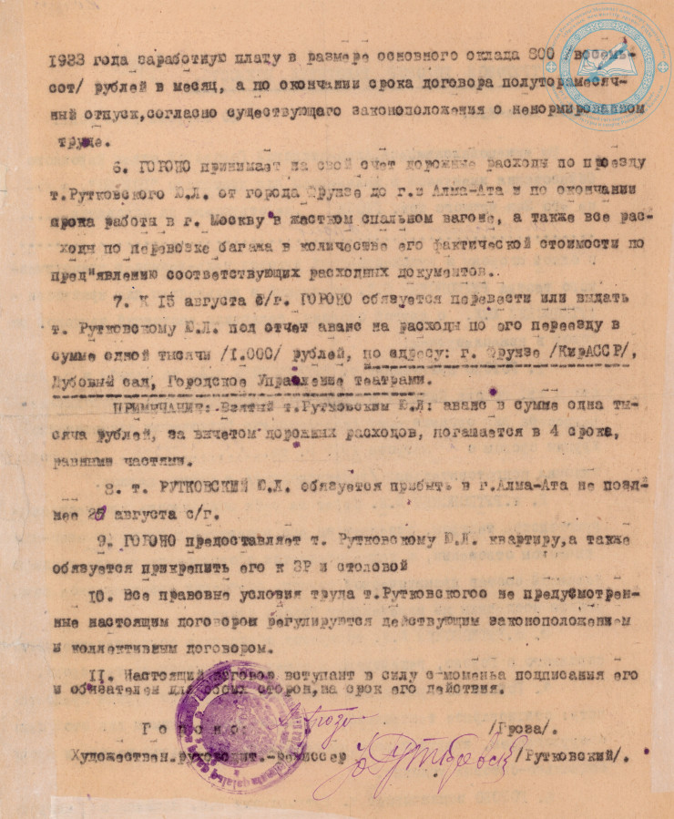 Трудовой договор Ю.Л. Рутковского с Алма-Атинским городским отделом народного образования о приеме на работу художественным руководителем-режиссером русского драматического театра. 1933 г. ЦГА РК. Ф. 1712. Оп. 1. Д. 29.