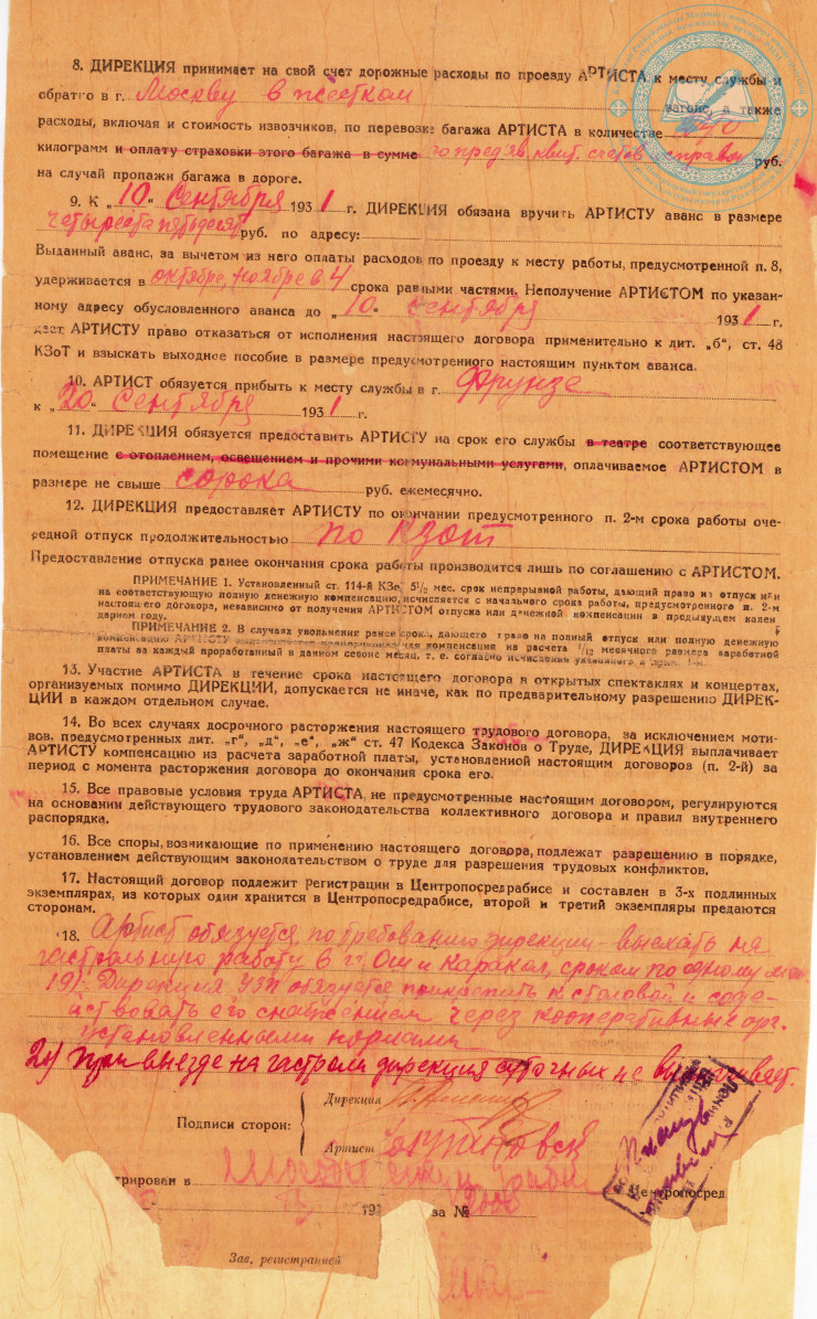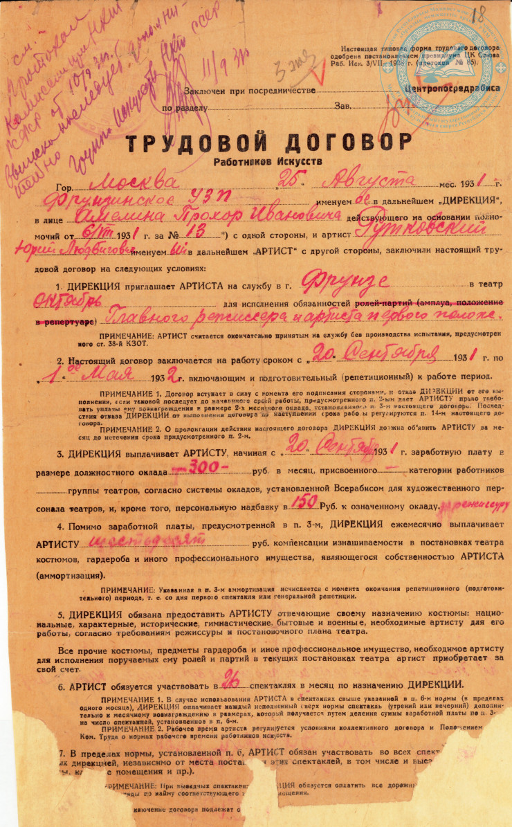 Трудовой договор Ю.Л. Рутковского с фрунзенским Управлением зрелищных предприятий. 1931 г. ЦГА РК. Ф. 1712. Оп. 1. Д. 29.