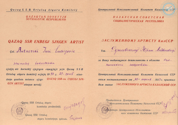Грамота Центрального исполнительного комитета Казахской ССР о присвоении Рутковскому Ю.Л. звания "Заслуженный артист Казахской ССР", 1937 г. ЦГА РК. Ф. 1712.