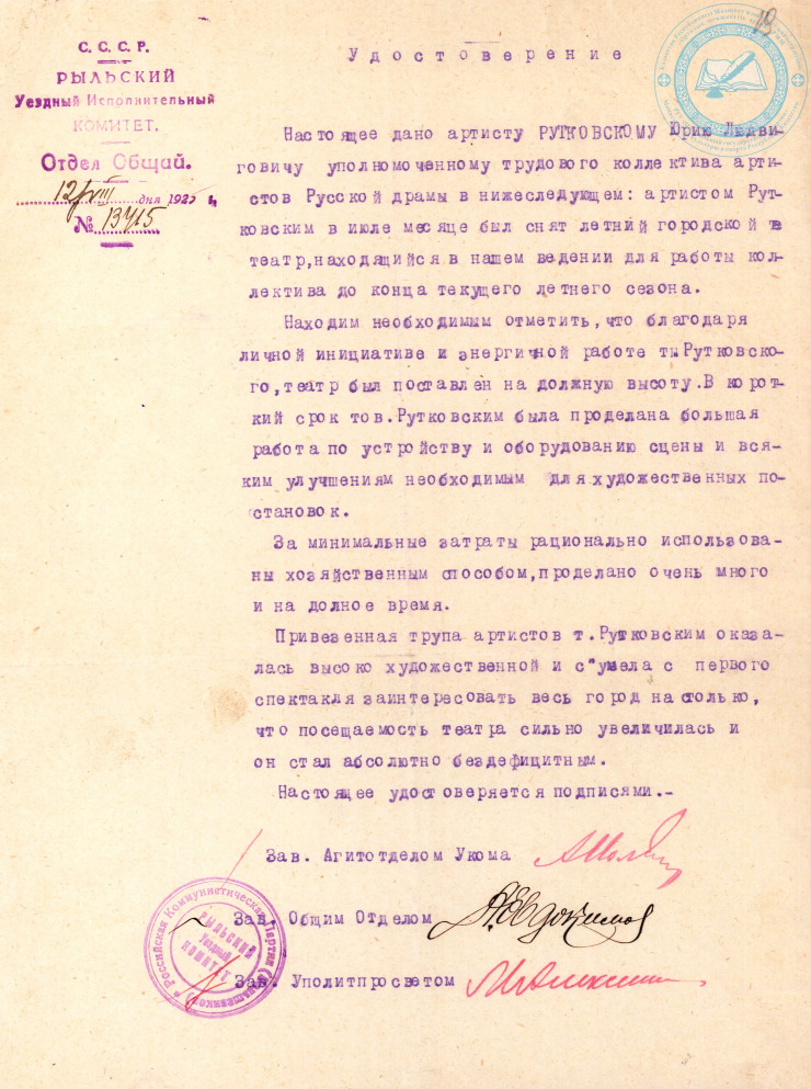 Удостоверение Рыльского уездного исполнительного комитета о работе Ю.Л. Рутковского и его труппы. 1925 г. ЦГА РК. Ф. 1712. Оп. 1. Д. 28