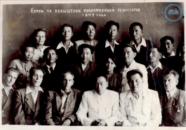 Курсы по повышению квалификации режиссеров. 1-й ряд слева направо: Б.Г. Ильинский (первый), Ю.Л. Рутковский (третий), С.А. Ахметов - начальник Управления по делам искусств при Совете министров Казахской ССР (четвертый), А.А. Алексеев (шестой). 1947 г. ЦГА РК. Ф. 1712. Оп. 1. Д. 20.