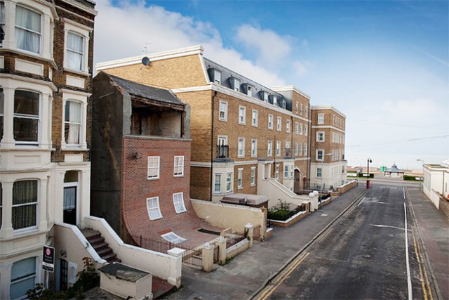 Британский художник и дизайнер Алекс Чиннек на удивление местным прохожим из графства Кент создал здание со "сползающим" фасадом, обнажающим верхний этаж.
