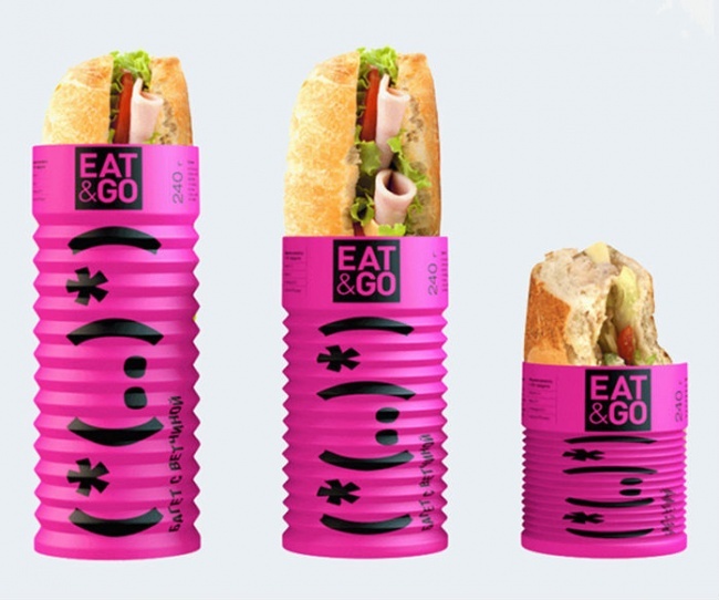 Складывающаяся гармошкой упаковка Eat&Go - это студенческая работа Ольги Гамбарян, Дианы Гибадуллиной, Александра Кищенко, Андроника Полоза. Очень удобно есть на ходу - обертка уменьшается по мере исчезновения сэндвича.