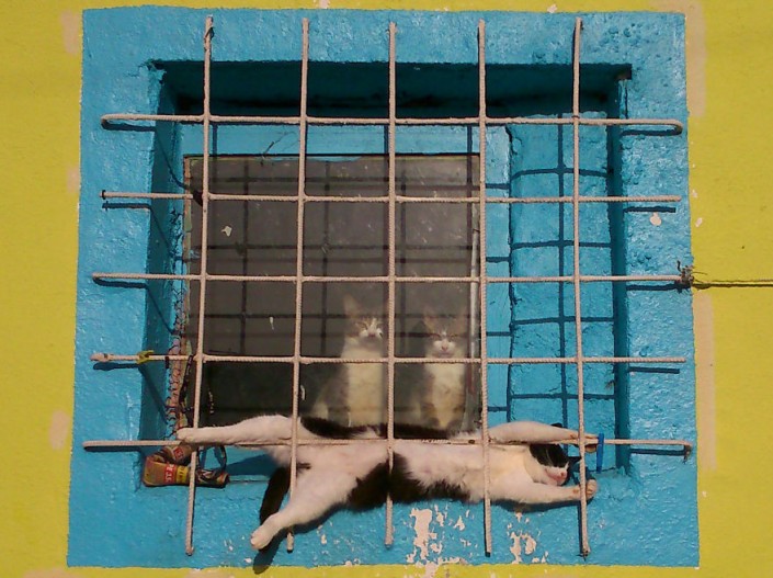 Не совсем понятно, чем занят черно-белый кот. Видимо, в такой позе очень удобно спать. Во всяком случае, вид у него довольно безмятежный. Чего не скажешь о двух его собратьях, которые смотрят в окно. На их мордочках очень серьезные выражения. Возможно автор фотографии увидел какой-то секретный ритуал из кошачьей жизни, о котором люди не должны были узнать.