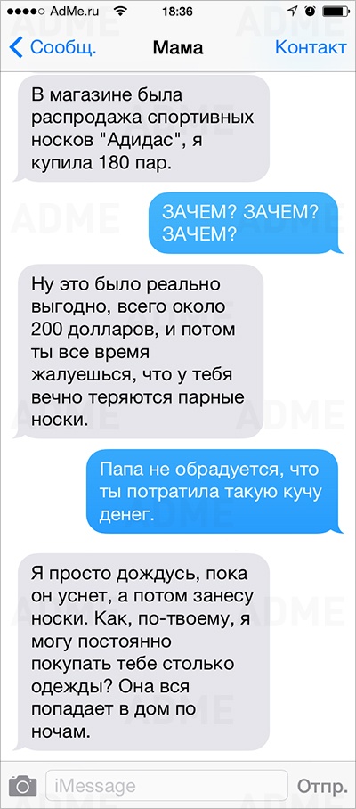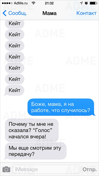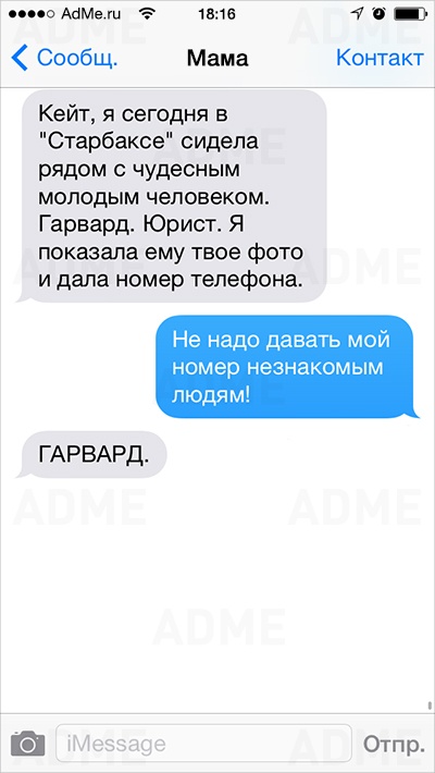 Американке Кейт Сигель повезло: ее мама не только любит давать советы и обладает отменным чувством юмора, но еще и обожает писать SMS. У Кейт накопилось столько шедевральных сообщений, что она начала выкладывать их в Instagram и Twitter, и ее мама сразу же обрела сотни тысяч поклонников. AdMe.ru перевел сообщения еврейской мамы Кейт и еще раз убедился: все-таки мамы одинаковы во всем мире.