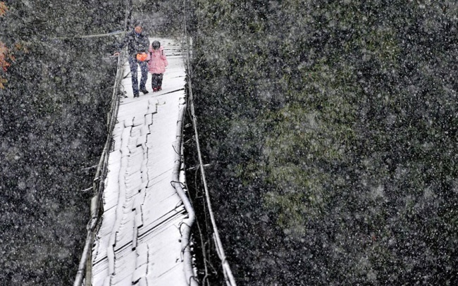 Во время пурги по сломанному мосту. Сычуань, Китай