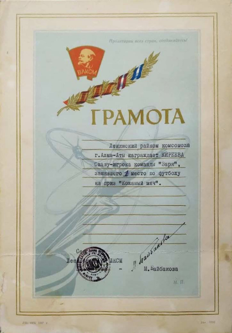 В том же году ребята постарше соорудили в Ленинском районе (с 1995 года переименован в Жетысуский - прим. ред.), где проживал Киреев, футбольное поле с воротами и сеткой. Для подростков, которые до этого в качестве ворот использовали портфели и произвольно отмечали линию ворот, это было счастье.