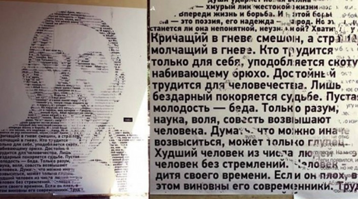 Напротив, самый интересный, на наш взгляд, стрит-арт - трехметровый портрет из его стихов. В работе, появившейся в 2014 году в Алматы, использованы не только цитаты великого поэта, но и текст из книги "Путь Абая" Мухтара Ауэзова.