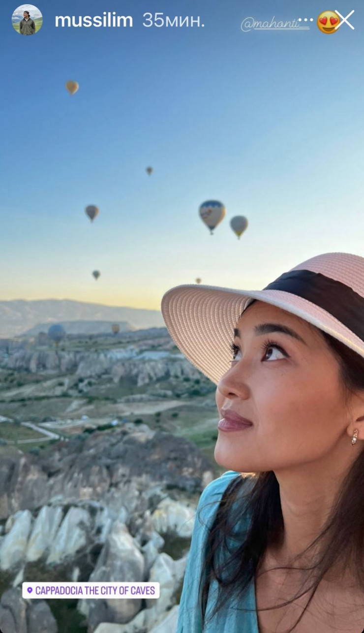 Как известно, эта местность славится своими необычными пейзажами. Туристы со всего мира прилетают сюда, чтобы прокатиться на воздушном шаре и сделать великолепные кадры. Сначала Тауекел Мусилим поделился фотографией своей супруги Махаббат в сториз. Она в нежном платье и шляпке позирует на фоне воздушных шаров.