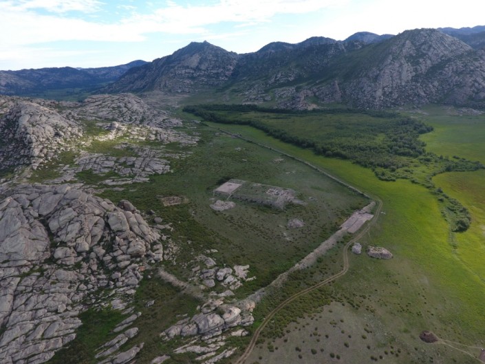 В юго-восточной части стены был въезд - "Священные ворота" или "Богдойн халга". Сегодня от них сохранилась лишь нижняя часть - два прямоугольных основания арки, сложенные из плитняка и оформленные по краям прямоугольными гранитными блоками, которые уложены плашмя.