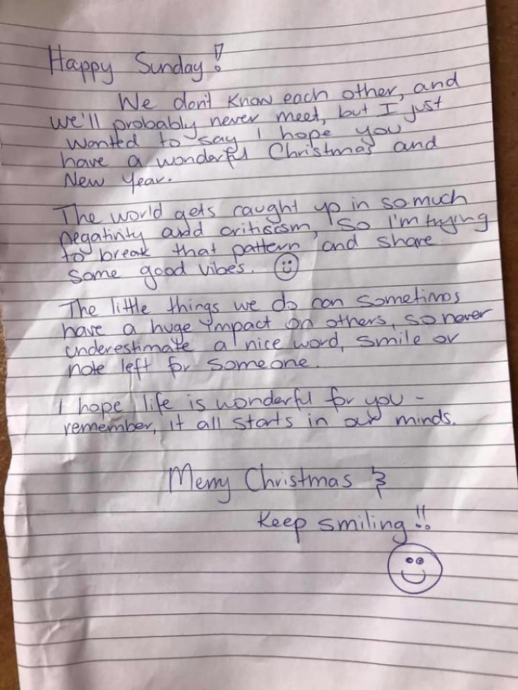 "Счастливого воскресенья! Мы не знаем друг друга и, возможно, никогда не встретимся. Но, надеюсь, вы отмечаете Рождество или Новый год. В мире полно негатива и критики, так что я сломаю этот стереотип и поделюсь позитивом. Маленькое добро, которое мы творим, может иметь огромное влияние на других. Жизнь должна быть прекрасной для вас. Помните, что все звезды могут сиять в вашем воображении. Счастливого Рождества! Продолжайте улыбаться", - поделился письмом пользователь под ником Марк Дугласс.