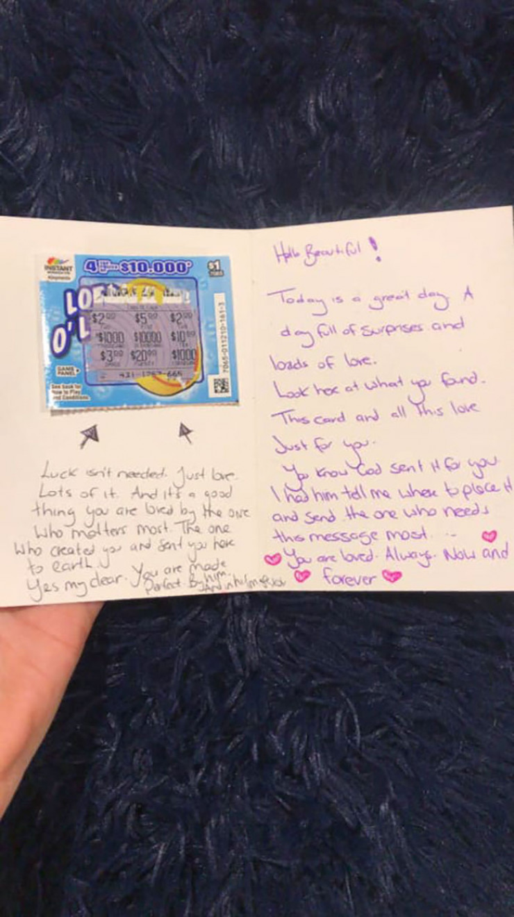 "Привет, красавица! Сегодня замечательный день. День, наполненный сюрпризами и любовью. Видишь, что ты нашла? Эту открытку и мою любовь. Ты знаешь, Господь отправил ее для тебя. Я спросил его, кто сейчас больше всего нуждается в этом послании, и он указал на тебя. Ты любима всегда, сейчас и навсегда", - показала письмо Лаура.