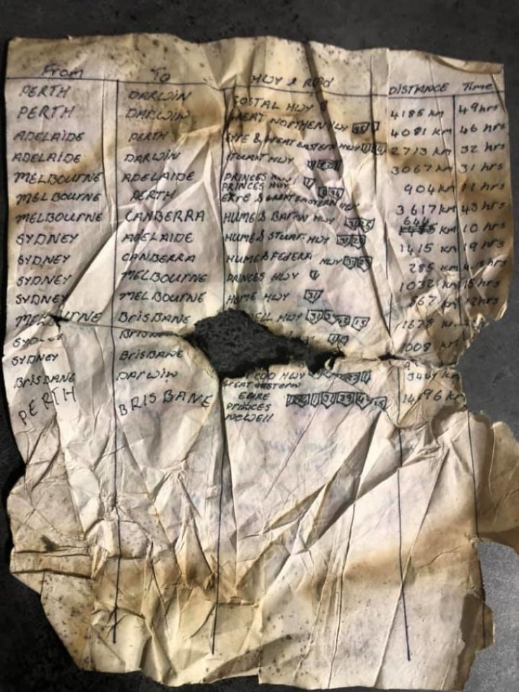 А этот помятый и обгоревший лист бумаги нашли еще в одном доме на колесах в Австралии. На нем указаны названия городов, которые посетили прошлые хозяева, за какое время они это сделали и какую дистанцию преодолели.