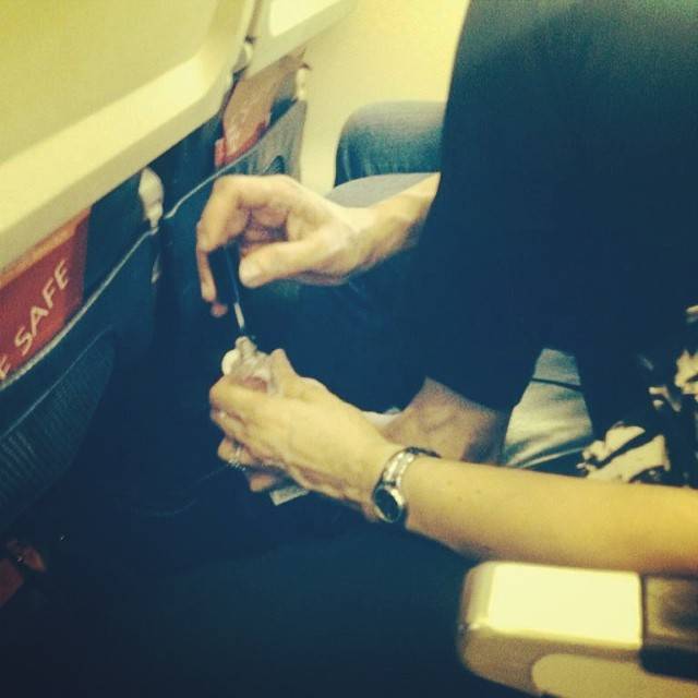 Жутко невоспитанные и некультурные пассажиры делают педикюр прямо во время полета, кладут ноги на столик для еды, напиваются и ведут себя крайне непристойно.