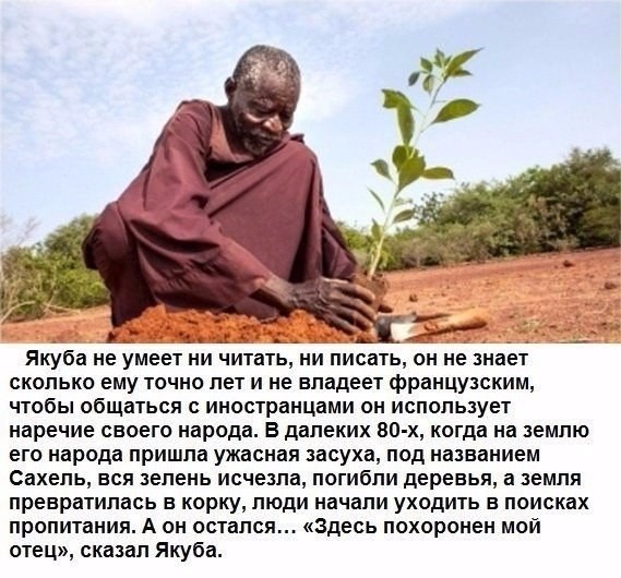 Вот уже 20 лет африканский фермер по имени Якуба Савадого ездит по пустыне и возрождает древнюю технику земледелия, повышая качества почвы. Все, что у него есть из инструментов, - это мотыга и твердая вера, что все можно изменить.