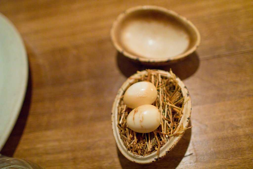 "Курица и яйцо" - одно из фирменных блюд ресторана, состоящее из перепелиных копчено-маринованных яиц, которые подаются в яйцеобразной коробочке.