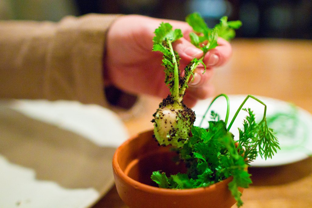 Чтобы полакомиться редиской, посетителям ресторана придется в буквальном смысле выдернуть ее из съедобной земли и обмакнуть в сливочный соус.