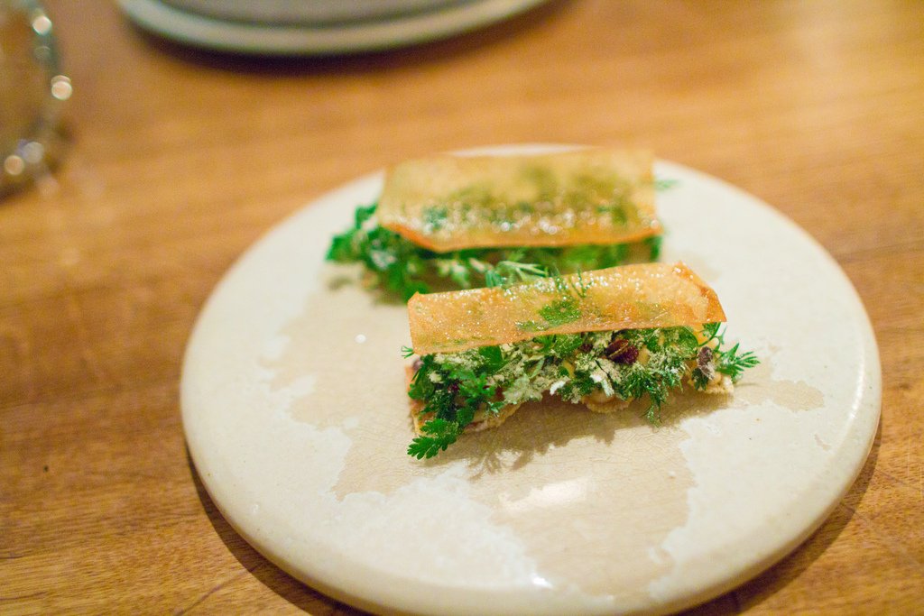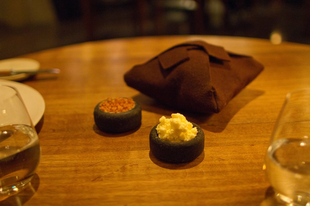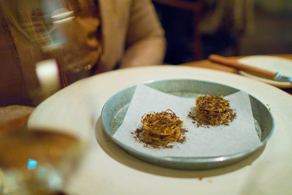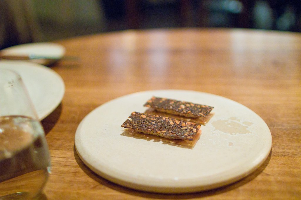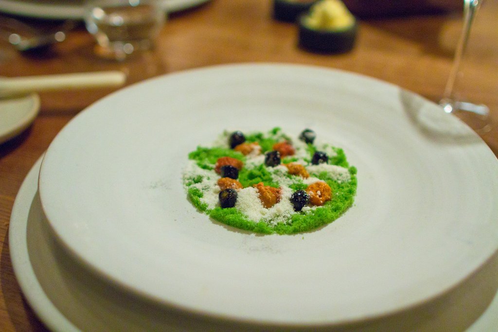 Первую закуску даже трудно отличить от сервировки стола. Это была пшеничная лепешка и можжевельник.