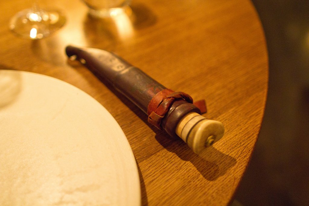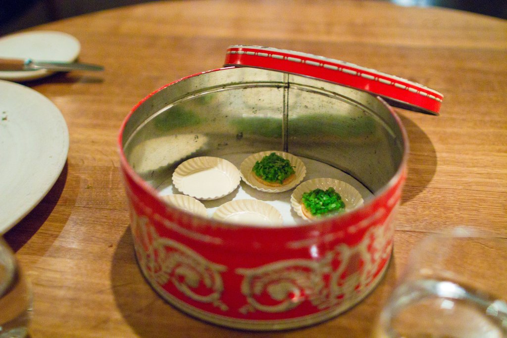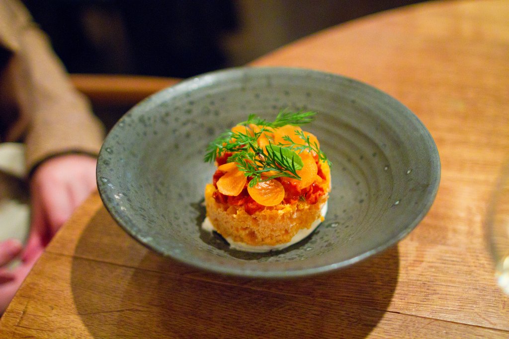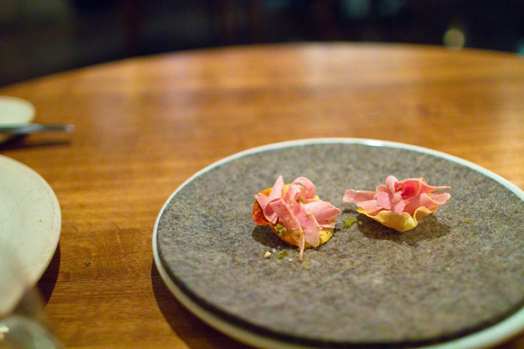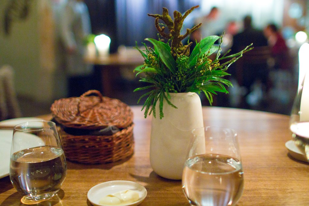 Первую закуску даже трудно отличить от сервировки стола. Это была пшеничная лепешка и можжевельник.
