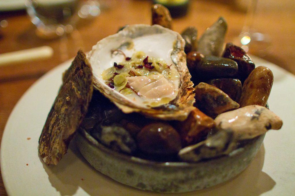 Лим-фьордские устрицы и морские водоросли с крыжовником и пахтой на камнях.