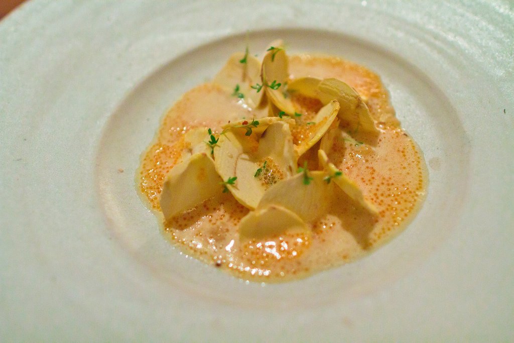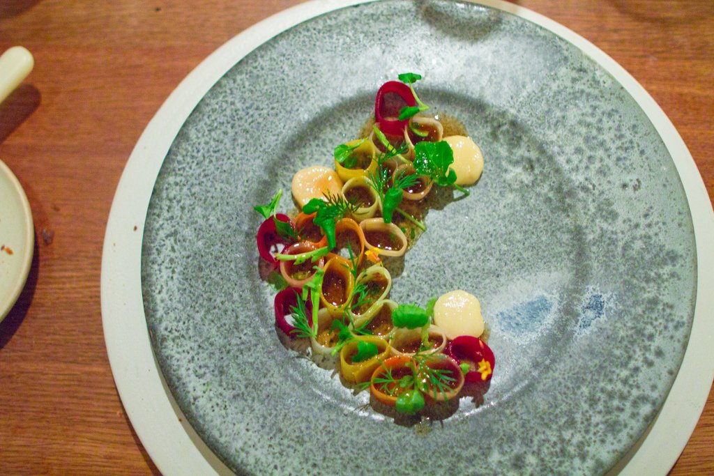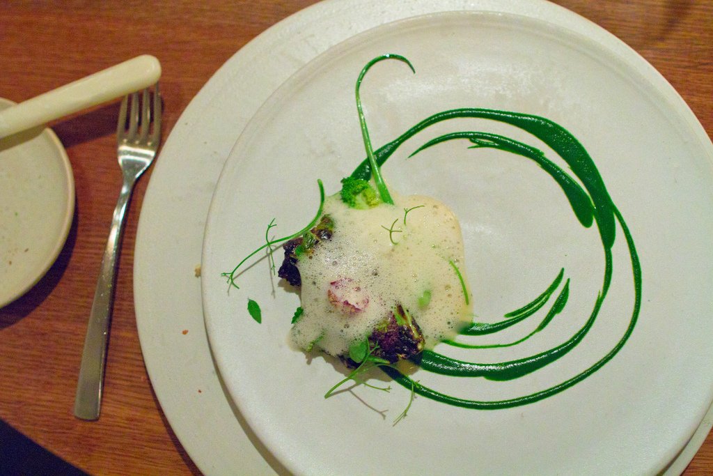 Парад основных блюд открывает кальмар с незрелыми ягодами терна. Блюдо подается с белой смородиной и муссом из свежей хвои.
