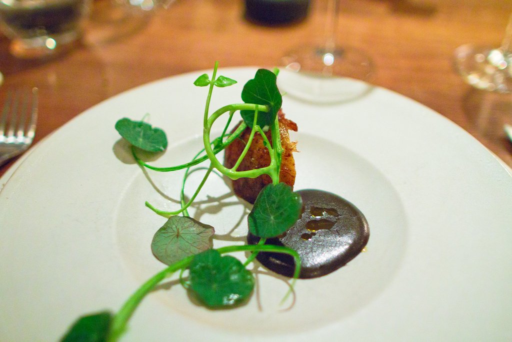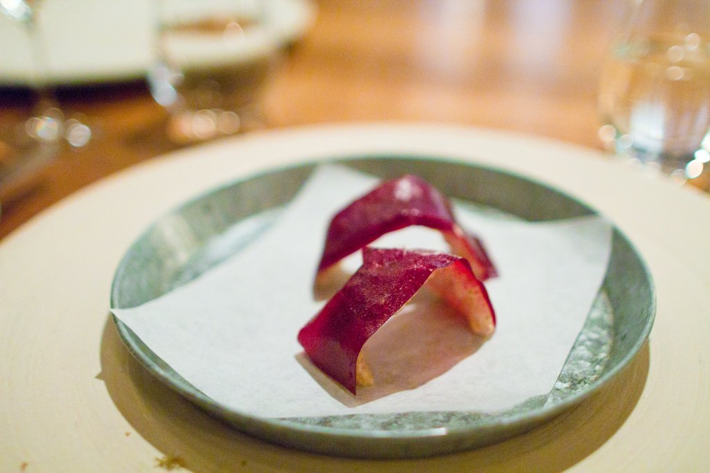 Хрустящая свиная кожа с черной смородиной (некоторые описывают это блюдо как "фруктовый ролл со шкварками").