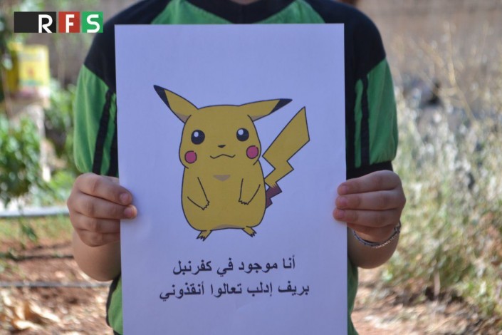 На плакатах написано: "Есть много покемонов в Сирии, приди и спаси меня", "Я покемон из Идлиба, приди и спаси меня".