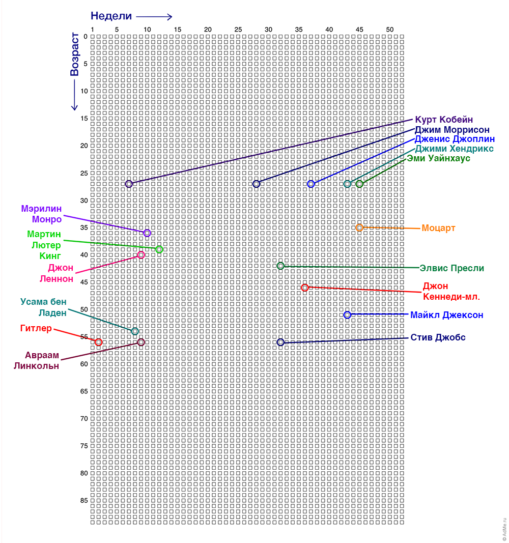 Получается полная карта всей вашей жизни размером с лист А4, которая дает наглядное представление о конечности вашей жизни и поможет ценить каждую ее неделю. Вы, вероятно, хотите спросить, где же на этом календаре дни недели, числа и месяцы?