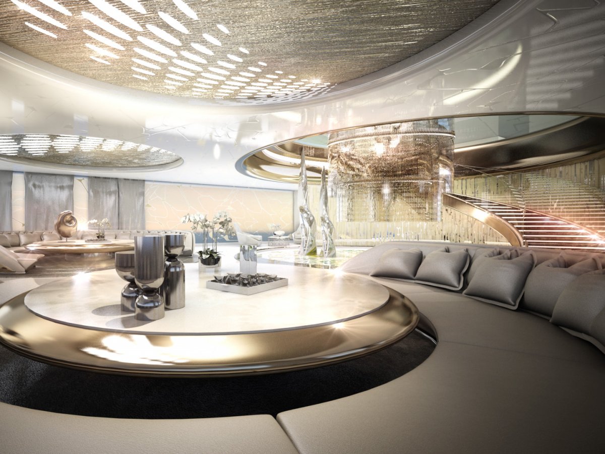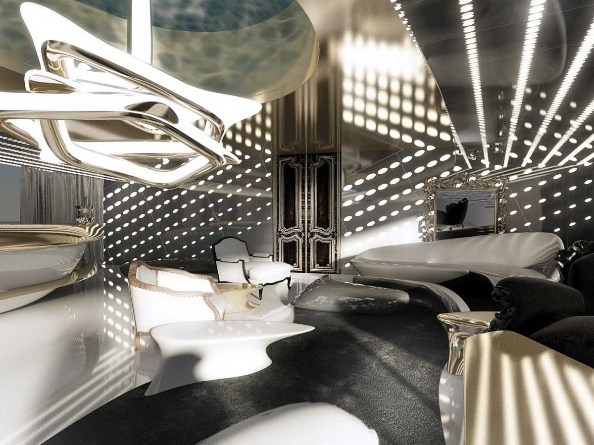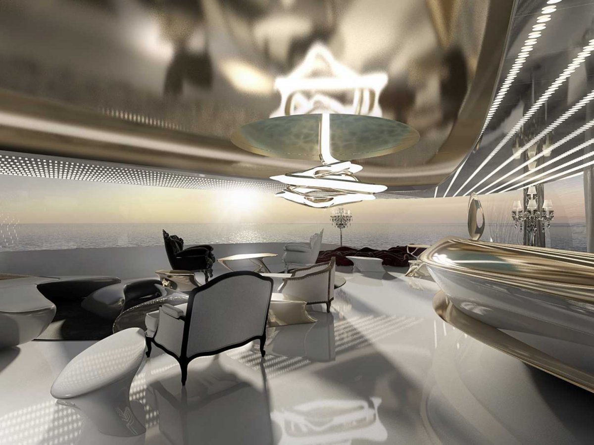 Внутри яхта оформлена экстравагантными деталями. Главный салон выглядит грандиозно.