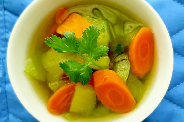 Арбузную корку и тонко нарезанную морковь варить в кастрюле на среднем огне в течение десяти минут, пока они не смягчатся. Добавить бульон и зелень. Довести до кипения, затем уменьшить огонь и тушить минут десять. Подавать суп теплым или охлажденным.