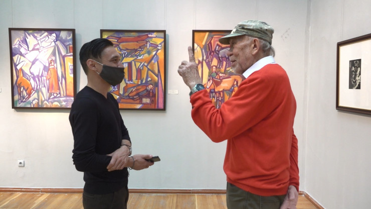 Табылды Мукатов на фоне своих работ в музее имени Кастеева. Октябрь 2020 года