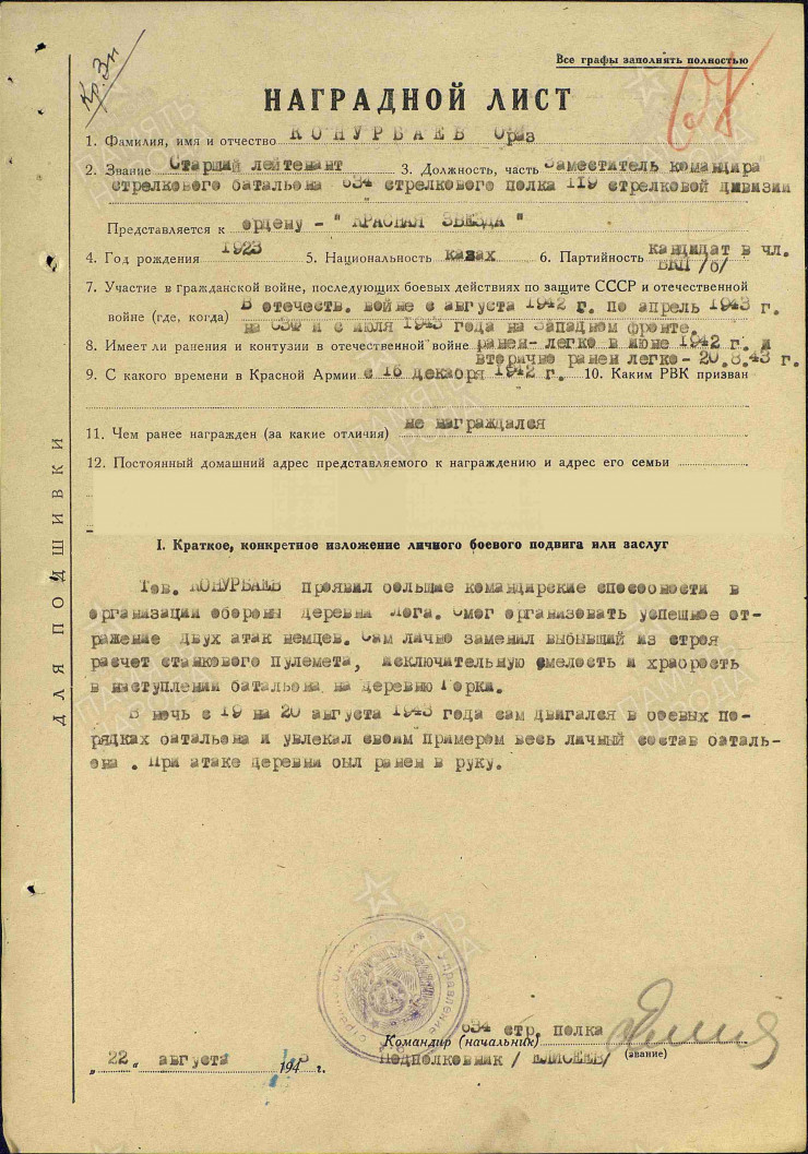 В информационной базе данных Министерства обороны России "Память народа" Конурбаев Ораз числится как капитан, командир стрелкового батальона 643-го стрелкового полка, 119-й стрелковой дивизии. Конурбаев Ораз родом из села Никольского Жарминского района Семипалатинской области, окончил 10 классов и в 1940 году в возрасте 17 лет был призван на фронт.