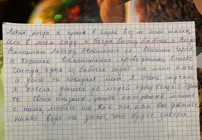 Иногда я задумываюсь, как она там? Как же больно было ее родителям терять ее? И понимать, что они больше не увидят, не обнимут, не прикоснуться к ней. Летом, когда я гуляю в парке возле моей школы или в моем саду, я всегда вижу бабочек, и всегда вспоминаю Латифу, вспоминаю ее внешние черты и хорошие воспоминания, проведенные вместе. Иногда одна из бабочек сидит на моем плече и долго не покидает меня. Я очень скучаю", - пишет Арина (орфография и пунктуация автора сохранены).