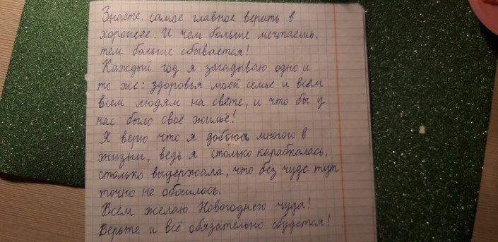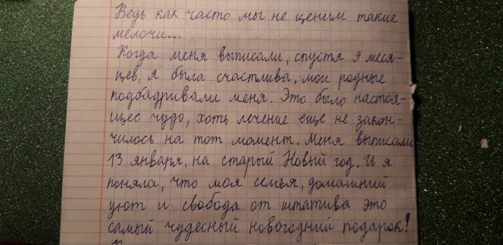 "Каждый Новый год я загадываю только одно желание. Я хотела бы, чтоб все дети, которые болеют, не огорчались, а боролись за свою жизнь, выход есть всегда. Если иметь смысл жизни, поддержку и стимул, то можно все побороть. Шесть лет назад я болела, так же, как сейчас некоторые дети, одна из самых страшных болезней поселилась внутри меня. Это было трудно пережить для меня и моих родителей.